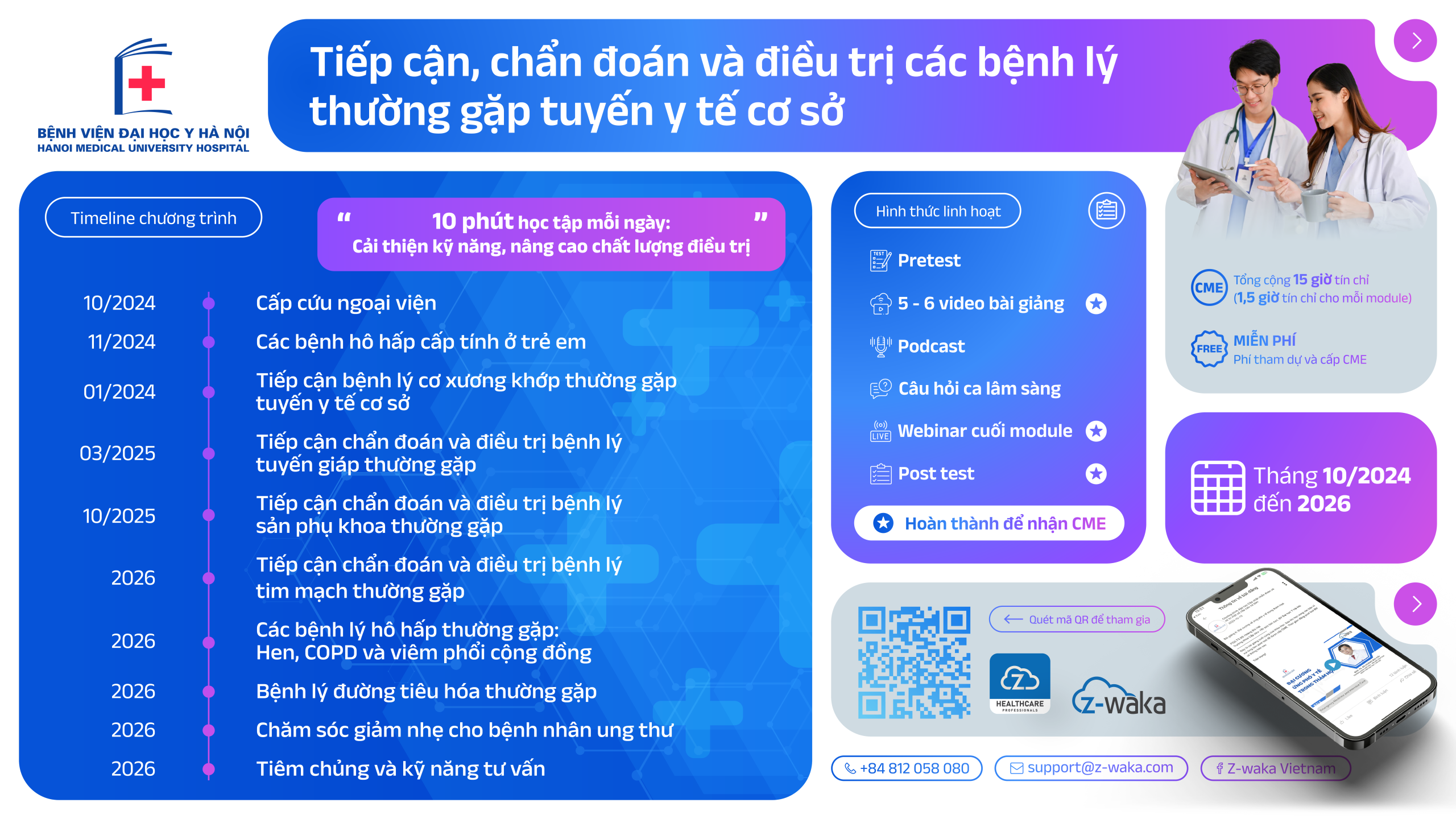 Khóa học này được tạo ra với mục tiêu giúp giảm thiểu tối đa gánh nặng bệnh tật trên từng người dân ngay từ tuyến cơ sở, nơi được mệnh danh là hàng phòng thủ đầu tiên của hệ thống y tế. Chương trình cung cấp các video bài giảng tự học có thể được theo dõi một cách linh động nhằm phù hợp với từng lịch trình bận rộn của quý đồng nghiệp. Ngoài ra, khóa đào tạo cũng bao gồm các buổi hội thảo trực tuyến, nơi các bác sĩ tuyến cơ sở có thể thảo luận và trao đổi với những chuyên gia hàng đầu đến từ khắp nơi trên cả nước, từ đó cùng nhau tháo gỡ những khúc mắc và rào cản thường gặp khi tiếp nhận chăm sóc ban đầu bệnh nhân. Với các câu hỏi ngắn, trò chơi đơn giản và ca lâm sàng mô phỏng, Chương trình hứa hẹn đem đến một phương pháp học tập đầy thú vị và hiệu quả, tạo điều kiện cho việc tiếp thu kiến thức và trau dồi kỹ năng xử lý trên thực hành lâm sàng.