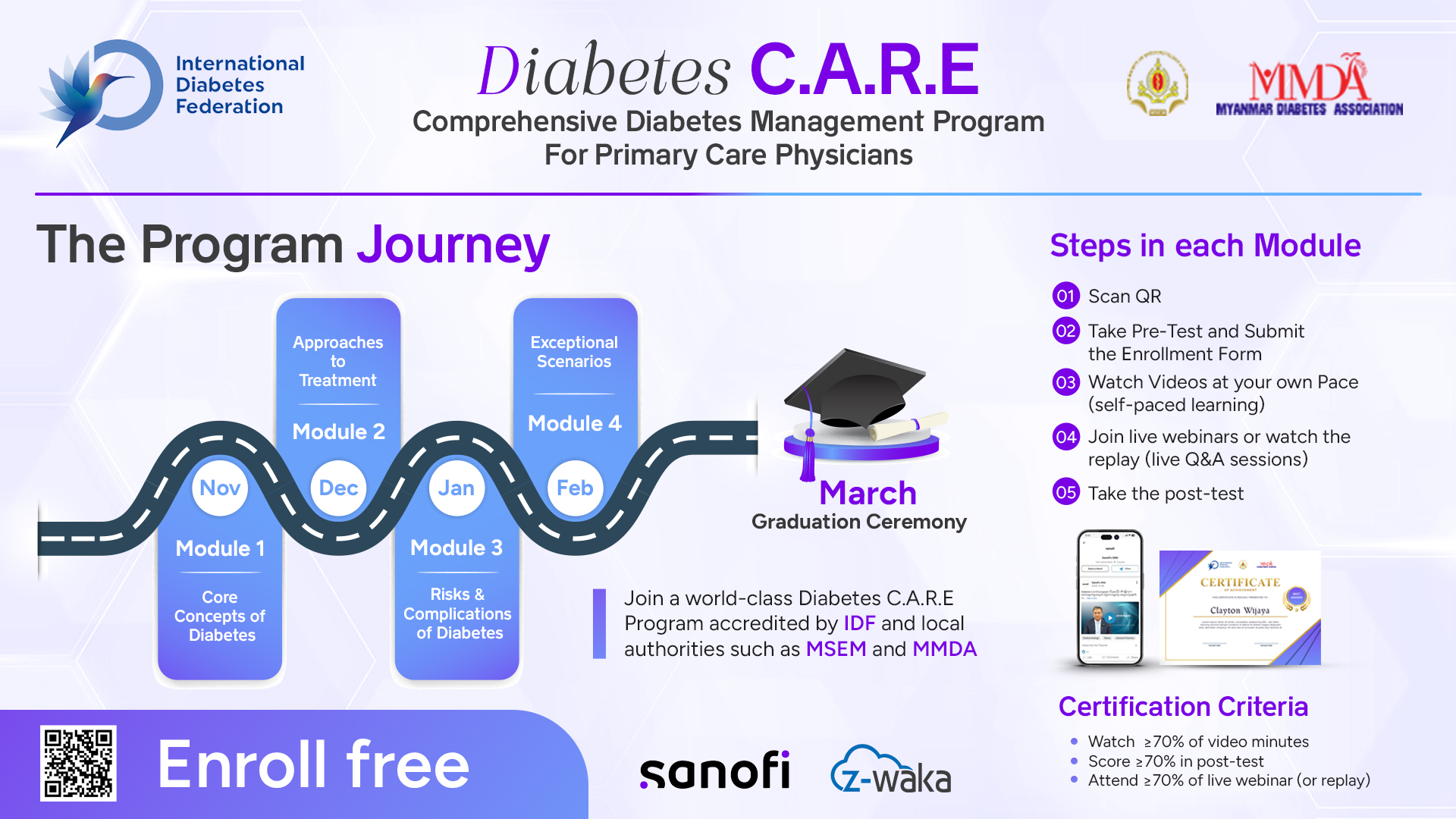 The Diabetes C.A.R.E. program consists of 4 modules for each track (Doctors and Nurses/Midwives), featuring expert lectures and live webinars. A Cardiovascular program will be announced soon.